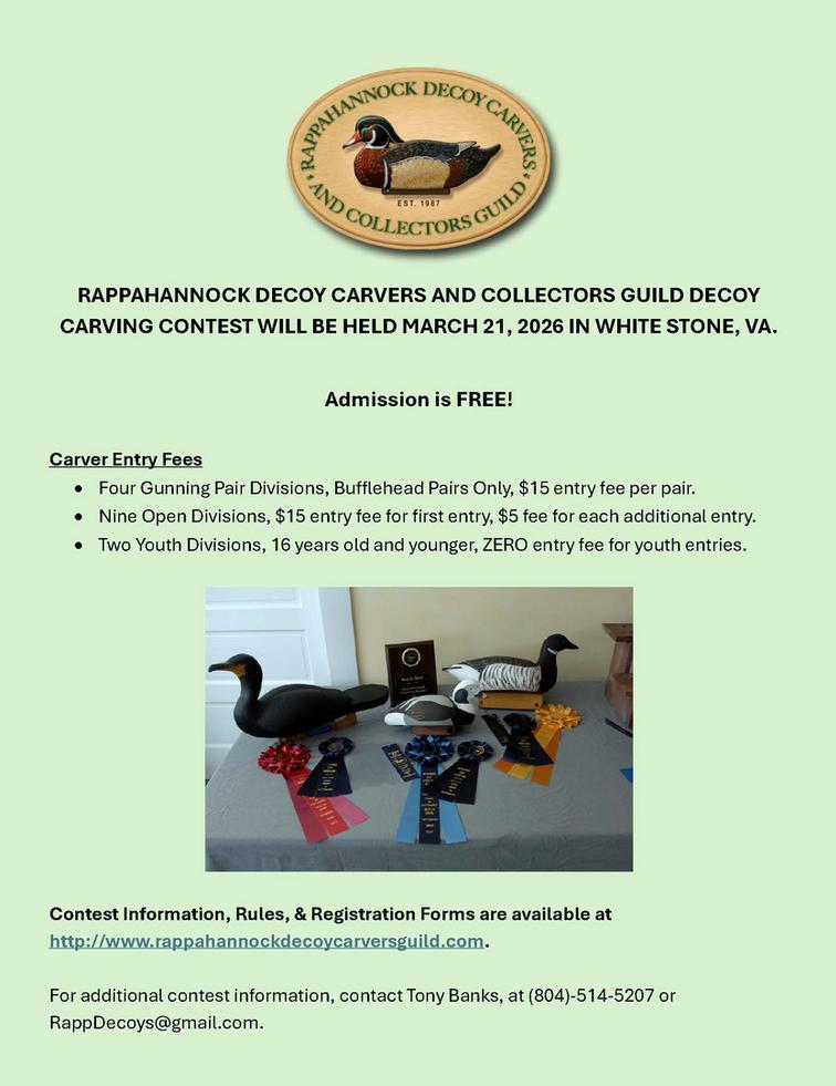 RAPPAHANNOCK DECOY CARVERS AND COLLECTORS GUILD DECOY CARVING CONTEST IS SCHEDULED FOR March 21, 2026.